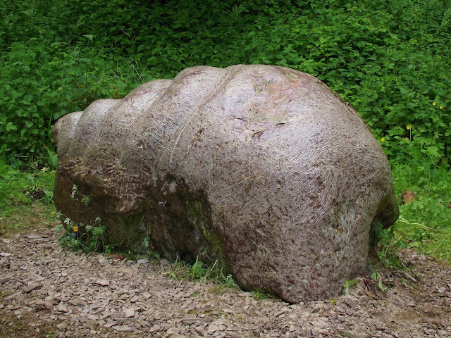 Under the hand of stone carver Lottie O'Leary, of Knucklas, Powys, a shell has re-emerged from a large limestone boulder. The work took five days and was undertaken with an angle grinder and a compressor-driven series of stone carving tools - the small photographs show stages of the carving. The shell is left incomplete to emphasize its origins - and those of the rock.